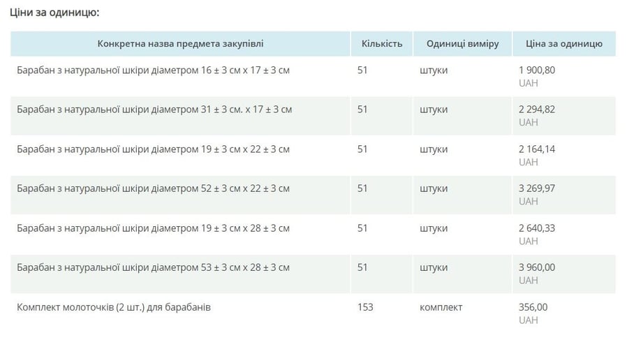 Торги завершено ще наприкінці квітня. З-поміж двох учасників виграв ФОП, з яким і уклали контракт. Зокрема, районна адміністрація закупила барабани з натуральної шкіри по 51 штуці в шести розмірах. Також до них закупили 153 комплекти молоточків. Сума договору становить 882 262,26 гривні.