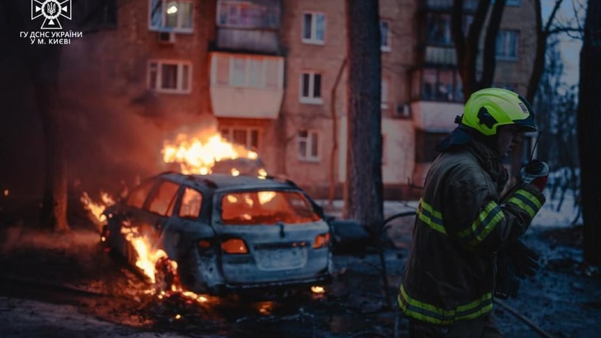 Унаслідок атаки на Київ пошкоджені 28 об’єктів, серед яких житлові будинки, медзаклад, навчальні заклади й автомобілі.