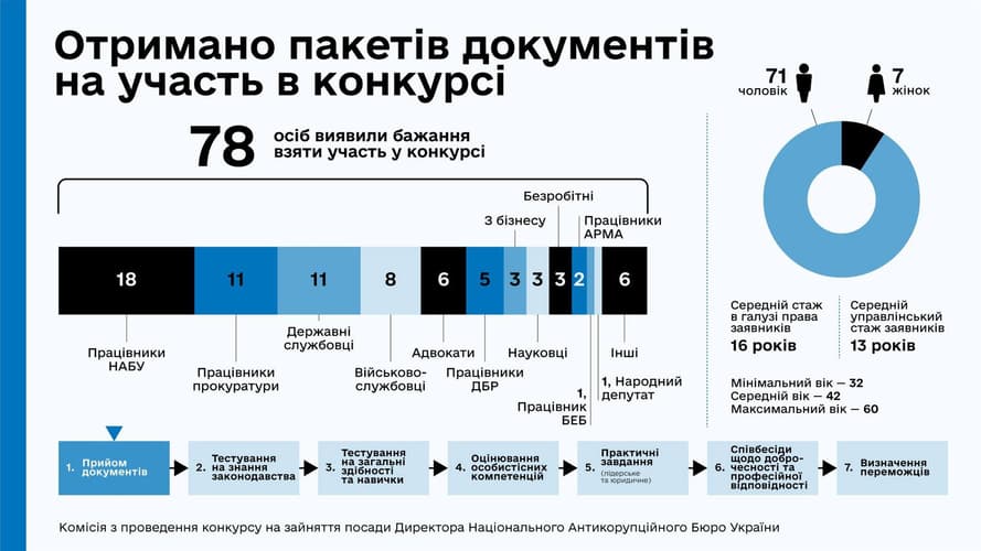 Більшість кандидатів — чоловіки (71). Лише 7 жінок вирішили брати участь у конкурсі. З-поміж тих, хто подав заяву, 18 працівників НАБУ, по 11 працівників прокуратури та держслужбовців, 8 військових, 6 адвокатів, 5 працівників Держбюро розслідувань та по троє представників бізнесу, науковців і безробітних.