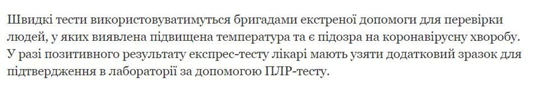 У МОЗ пояснили, що експрес-тести будуть використовувати лікарі закладів охорони здоров'я для «санітарного сортування», тобто медики мають зробити два тести: один на грип і один експрес-тест на коронавірус. Це потрібно, щоб вирішити, який алгоритм дій застосовувати далі.