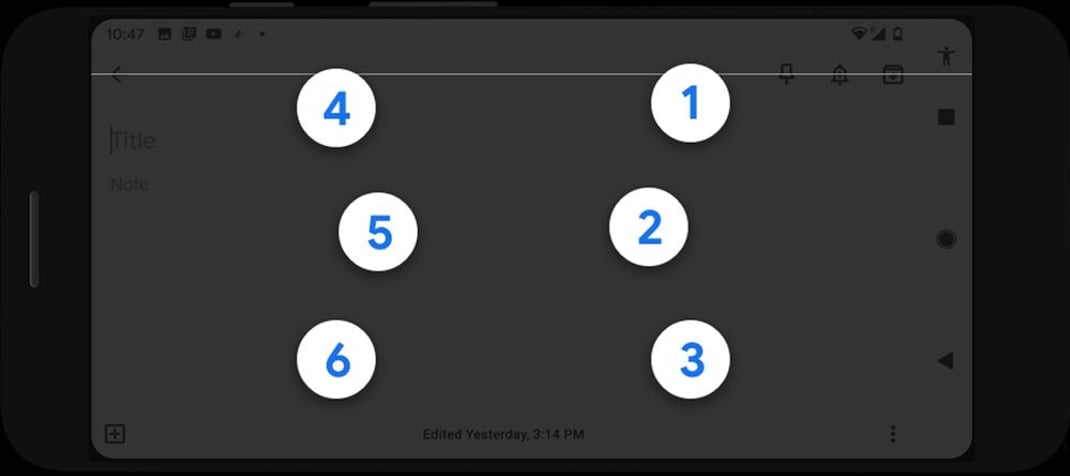 На клавіатурі TalkBack різні комбінації шести крапок позначають різні символи. Так, 1 — це «А», а 1 і 2 — це «В».