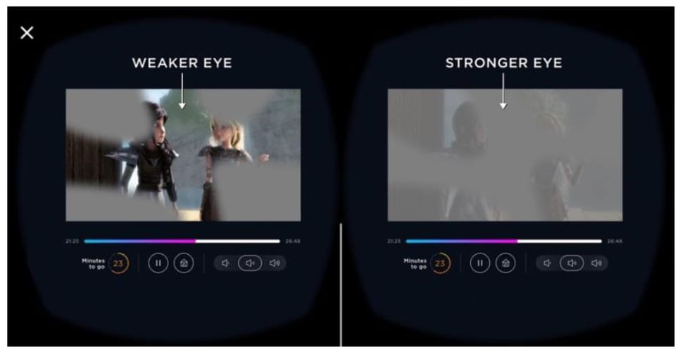 Luminopia One працює за дещо схожим принципом. Пацієнти надягають VR-окуляри, у якому їм показують улюблені мультфільми чи інші передачі. «Сильніше» око бачитиме менш контрастне зображення, що спонукає мозок активувати обидва ока.