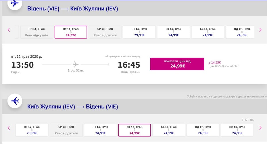 Wizz Air пропонує на 12 травня квитки з Києва до Відня за 29,99 євро та з Відня до Києва за 24,99 євро.