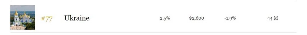 Україна посіла 77 місце серед 161 країни світу у рейтингу Forbes найкращих країн для ведення бізнесу. Рейтинг The Best Countries For Business оприлюднений на сайті журналу.