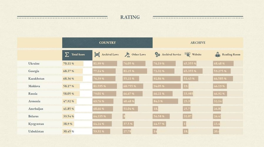 Найвищі показники в рейтингу з українських архівів отримали Галузевий державний архів Служби безпеки України (ГДА СБУ) та Центральний державний історичний архів України (ЦДІАК України).