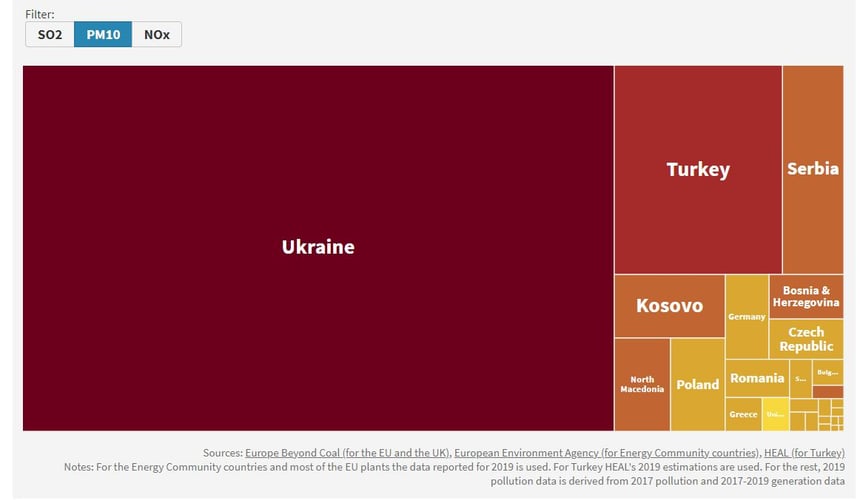 Так, українські вугільні електростанції відповідальні за 72% викидів PM10. Зокрема до топ-10 забруднювачів увійшли 8 українських електростанцій, на першому місці Курахівська теплова електростанція. А у першій тридцятці зазначені 18 українських ТЕС.
