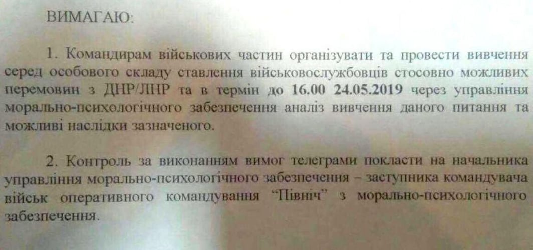 «Командирам військових частин організувати та провести вивчення серед особового складу ставлення військовослужбовців стосовно можливих перемовин з «ДНР»/«ЛНР» та в термін до 16:00 24.05.2019 через управління морально-психологічного забезпечення (доповісти – ред.) аналіз вивчення даного питання та можливі наслідки зазначеного», — йдеться в тексті документа.