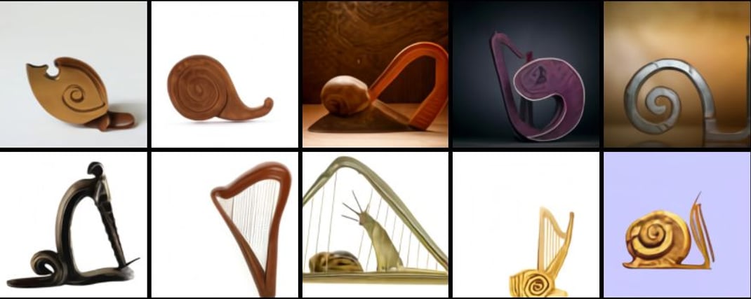 Такі варанти нейронна мережа запропонувала на запит «равлик, зроблений з арфи».