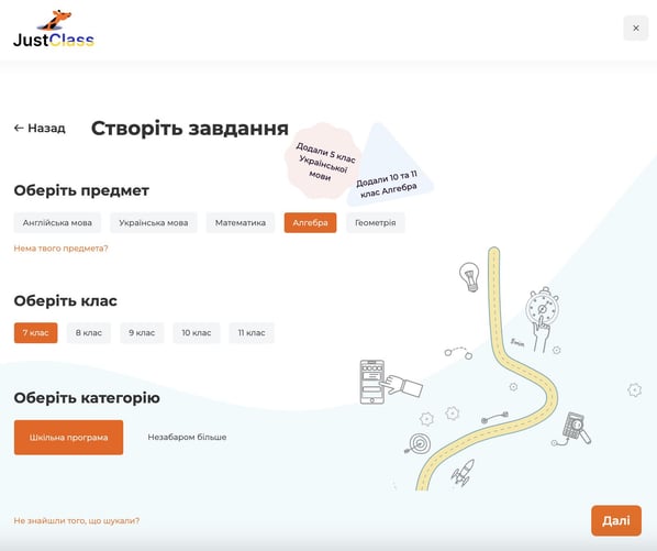 Наразі в JustClass є вже понад 1500 інтерактивних вправ для 5-11 класів. Усі вони розроблені за шкільною програмою. Крім математики, української та англійської мов, команда JustClass планує додати завдання й з інших предметів.