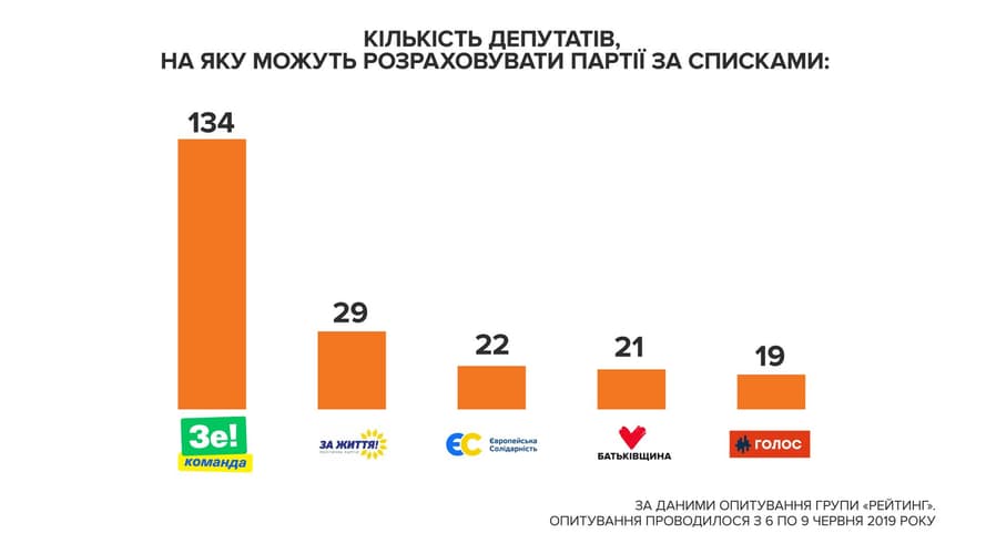 За даними опитування групи «Рейтинг», проведеного з шостого по дев’яте червня, у парламент потрапляють п’ять політичних сил. На майже половину голосів може розраховувати партія президента «Слуга народу» — 134 мандати. Решта партій ідуть із значним відривом. Це партії «Опозиційна платформа – За життя» (29 мандатів), «Європейська солідарність» (22 мандати), «Батьківщина» (21 мандат) і партія «Голос» (19 мандатів).