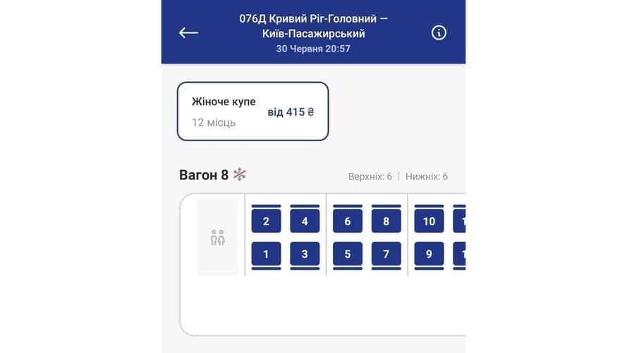 Перші розмови про жіночі купе в колективі «Укрзалізниці» були місяці два тому, каже Юлія. На практиці виявилося, що жіночими є лише три купе на весь вагон (і на весь потяг). Це перші 12 місць у восьмому вагоні. Так само й на інших маршрутах. Усі квитки сюди розкупили. Якщо буде попит, функцію з тестової зроблять постійною, а може, й виокремлять для цього вагон повністю.