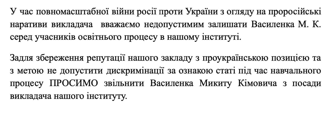 «Викладач зловживає сексистськими коментарями в бік студенток. У час повномасштабної війни росії проти України зазначений викладач розповідає студентам на заняттях про "велич росії"», — вказано в листі, який підписали понад 170 студентів ННІЖ.