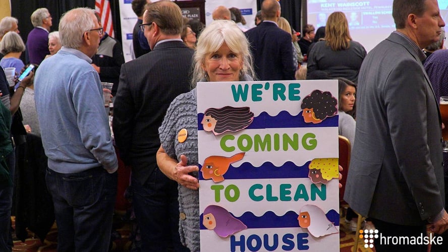 Джилл Фергюссон — одна з найяскравіших учасниць на зустрічі демократів, що відбувається ввечері після голосування. Пенсіонерку важко не помітити: в готель, де триває свято, вона принесла власноруч зроблені плакати: в залі постійно тримає їх над головою. З матір’ю сюди прийшов її син.