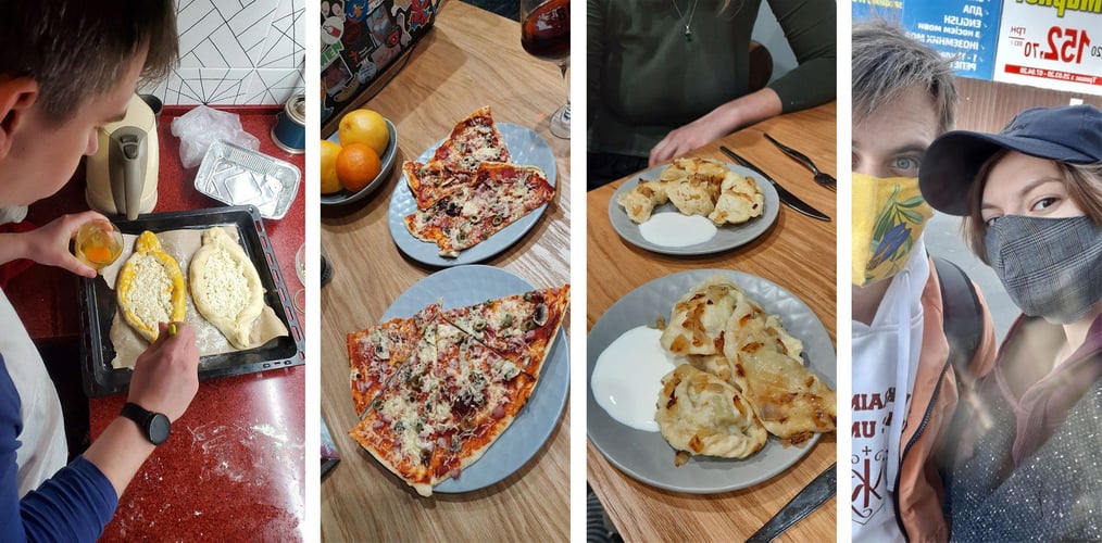 Спочатку було цікаво зробити справжню неаполітанську піцу, і ми купили дріжджі для тіста. Вийшло прекрасно. Потім, раз уже є дріжджі і немає бажання виходити в магазин, ми почали пекти вдома хліб. Уявляєте, без хлібопічки, справжній домашній хліб. Він навчився вправлятися з тістом, як професіонал, за ці кілька тижнів. Потім ми вперше зварили борщ, вийшло дуже смачно.