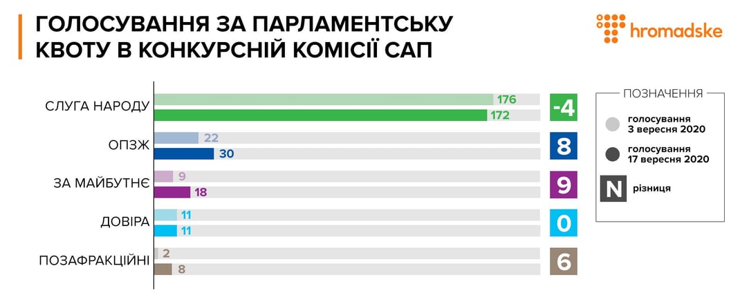 Що змінилося з того часу? У список претендентів до конкурсної комісії САП внесли дві заміни. Замість Ганни Власової з групи «Довіра» та Віталія Куца зі «Слуги Народу» в число претендентів включили Олену Бусол та Катерину Коваль із групи «За майбутнє».