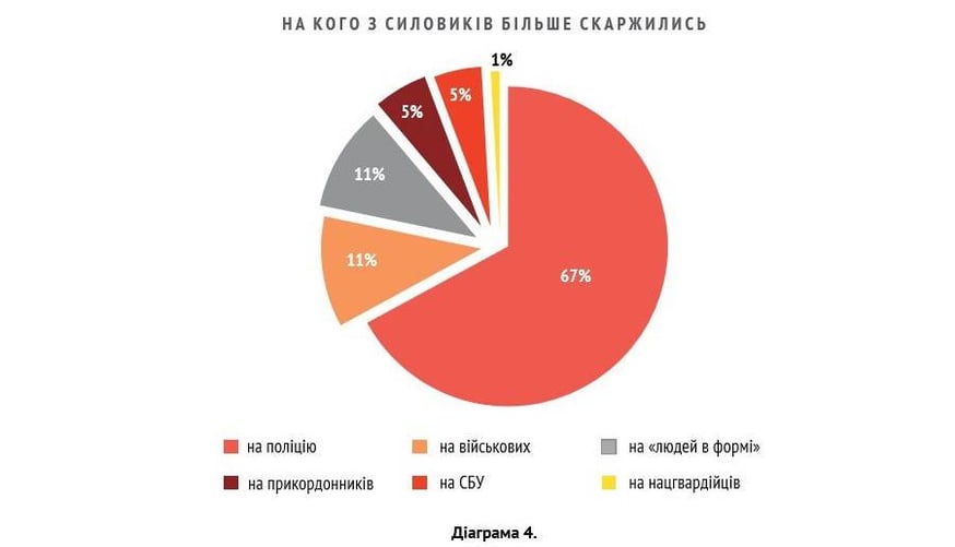 Діаграма нижче відображає дані без урахування скарг, які не стосувалися дій чи бездіяльності поліції, нацгвардійців, військовослужбовців Збройних Сил України, прикордонників та співробітників Служби безпеки України.