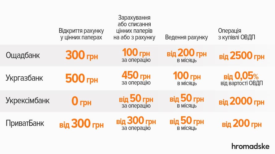 Однак це далеко не весь перелік послуг. Заплатити банку доведеться, наприклад, за виписку про стан рахунку у цінних паперах, за отримання доходу, перерахування коштів з одного рахунку на інший тощо. Детальніше з тарифами банків можна ознайомитися за цими посиланнями: ПриватБанк, Ощадбанк, Укргазбанк та Укрексімбанк.