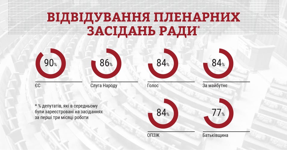 Від «Європейської Солідарності» в середньому на засіданнях реєструвалися 90% депутатів. На другому місці за цим показником — «Слуга Народу», 86%.