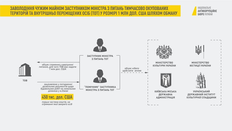 - За словами генпрокурора Юрія Луценка, вони вимагали гроші за вплив на рішення судів і чиновників Мінкультури для ухвалення замовних рішень щодо будівництва.