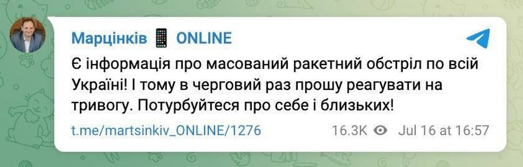 Зазначимо, що вдень 16 липня низка Telegram-каналів поширила інформацію про нібито запуск 48 ракет з Астрахані по території України. Міський голова Івано-Франківська Руслан Марцінків теж заявив у соцмережах, що нібито готується масований ракетний удар по Україні, але згодом видалив пост.