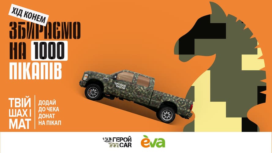 Лінія магазинів EVA та команда благодійного проєкту «ГЕРОЙCAR» запустили ініціативу «Хід конем», щоб підтримати збір на 1000 пікапів для українських військовослужбовців.