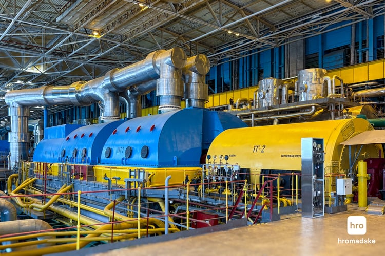 Нас заводять до машинної зали. Тут спекотно. Сюди надходить гаряча пара, яка обертає турбіни, а далі конденсується. Воду охолоджують у градирнях і ставках, після чого почнеться новий цикл перетворення її на пару. Водночас частину гарячої води використовують для опалення й гарячого водопостачання.