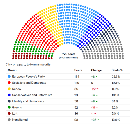 В общем больше всего мест (184) получила группа «Европейская народная партия», которая уже заявила, что будет иметь четкую проевропейскую и проукраинскую позицию. Второе место получил левоцентристский «Прогрессивный альянс социалистов и демократов» (139 мест), а третье — проевропейская группа «Обновить Европу» (Renew) с 80 местами.