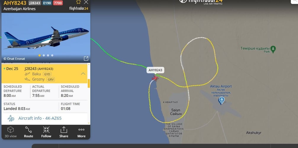 В правительстве Казахстана сообщили, что самолет Embraer 190 принадлежит Azerbaijan Airlines. Он выполнял рейс из столицы Азербайджана, Баку, в город Грозный в россии. По данным аэропорта Чечни, из-за тумана в Грозном самолет перенаправили в Махачкалу, а затем в Актау.