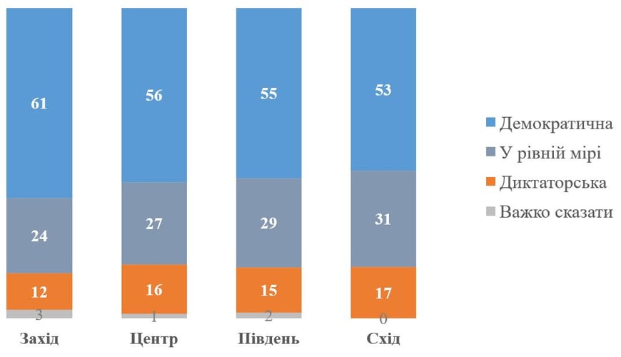 Социологи отметили, что с запада на восток становится меньше тех, кто считает Украину демократией. Но фактически во всех регионах большинство придерживается мнения, что Украина сохраняет свою демократичность (и не более 17% считают Украину диктаторской).