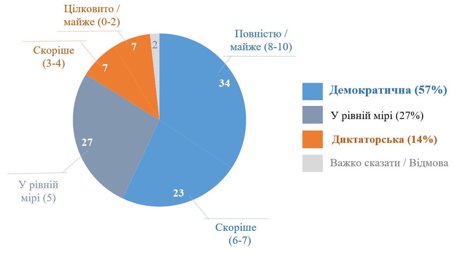 Большинство опрошенных украинцев — 57% — считают, что Украина скорее или полностью является демократичной. В то же время 14% ответили, что Украина — диктаторская.