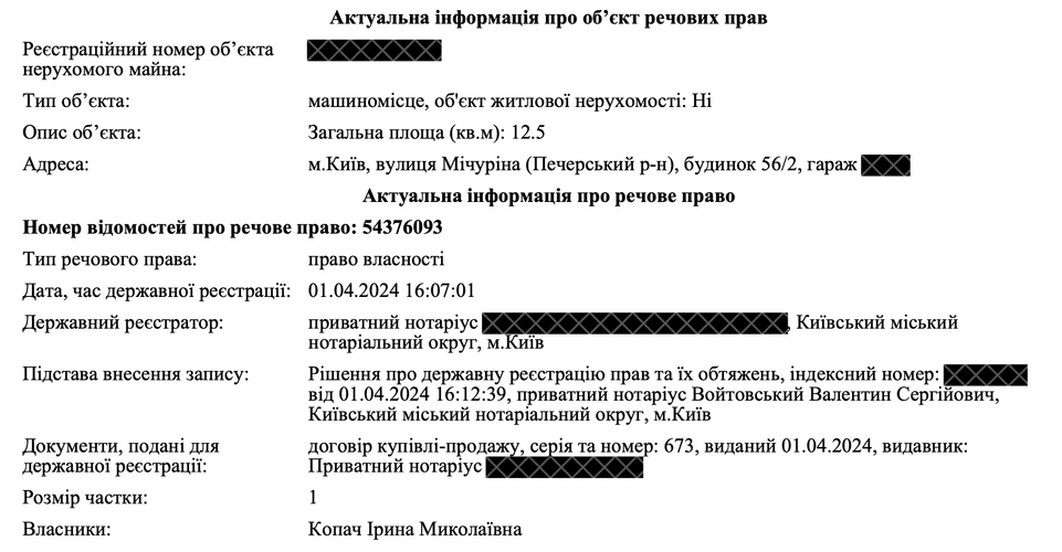 А в апреле 2024 года на Ирину Копач оформляют еще и отдельный паркинг в этом же ЖК за 100 тысяч гривен.