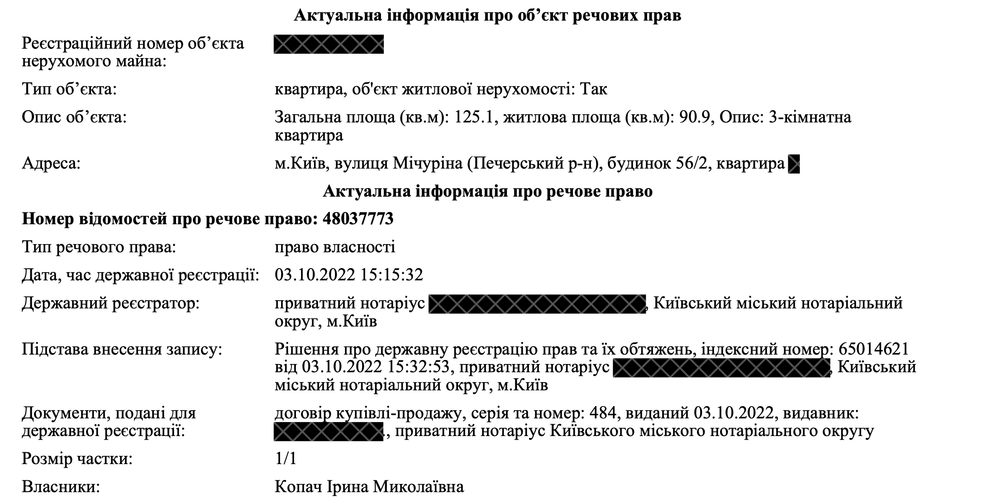 Квартиру, где ныне проживает полковник ГБР Александр Удовиченко с семьей, в 2018 году она передала практически себе же. Вернее, ООО «Гранд Рент», основательницей которого она стала. Именно у этой компании в октябре 2022 года косметолог из Одессы Ирина Копач покупает квартиру в Regent Hill по заниженной в 18 раз стоимости.