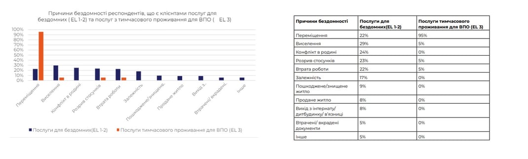 Организация делает вывод, что полномасштабное вторжение россии стало пока основной причиной бездомности в Украине. Среди других причин, респонденты чаще всего называли выселение, конфликты в семье, разрыв отношений и потерю работы.