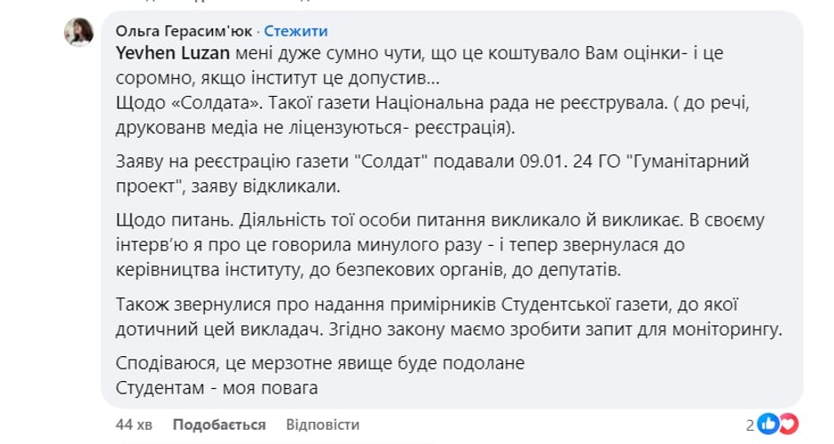 «Также обратились относительно предоставления экземпляров Студенческой газеты, к которой причастен этот преподаватель. Согласно закону, должны сделать запрос для мониторинга. Надеюсь, это мерзкое явление будет преодолено. Студентам — мое уважение», — написала она.