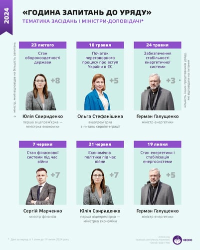 В 2024 году в Верховной Раде возобновили «час вопросов к правительству», который регулярно не проводили с начала полномасштабного вторжения. В этом году состоялось 6 встреч, где задавали вопросы о налогах, мобилизации и ситуации в энергетике.