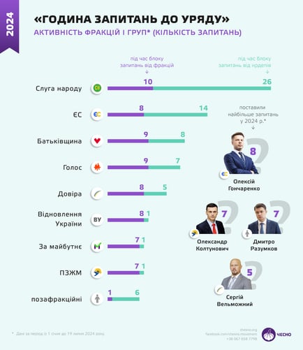 В 2024 году суммарно больше всего вопросов задали нардепы от фракции «Слуги народа». В то же время ожидаемо достаточно активной в вопросах к правительству, фактически сформированного большинством, была оппозиция. Вопросы от фракции «Европейская солидарность» в «Честно» назвали «острыми».