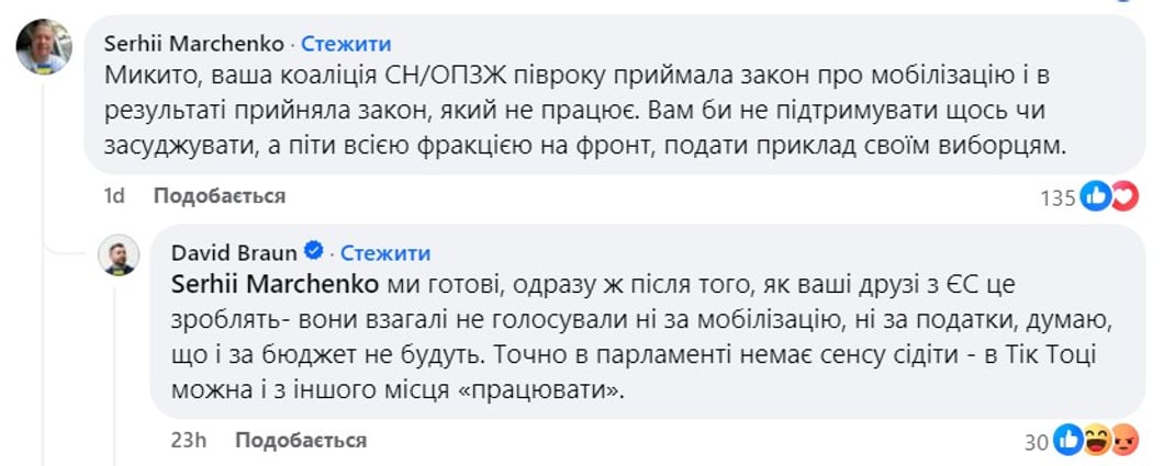 В комментариях к публикации его обвинили в том, что его фракция поддержала закон о мобилизации, «который не работает», и призвали «подать пример своим избирателям», пойдя на фронт.
