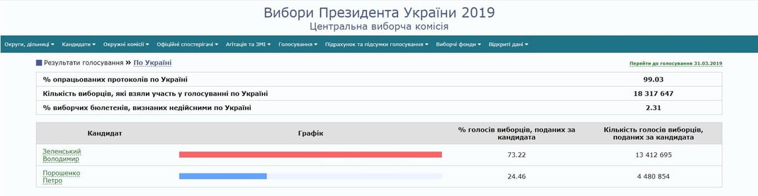 За Зеленского отдали свои голоса 73,22% избирателей, за Порошенко — 24,46%.