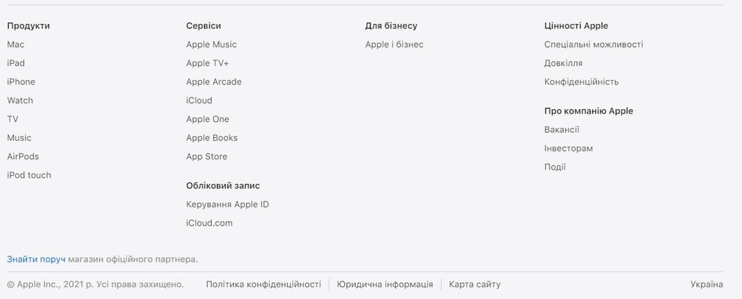 Так, сейчас на apple.com/ua уже переведены на украинский названия отдельных блоков сайта. Компания также указала своих официальных партнеров в Украине.