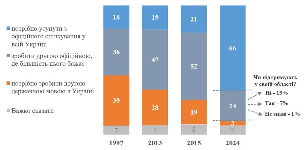 Так, согласно опросу, по состоянию на февраль 2024 года 66% украинцев считают, что русский язык нужно устранить из официального общения, 3% выступают за то, чтобы этот язык получил статус второго государственного. По мнению остальных 24% населения, русский язык может стать официальным в тех регионах, где этого захочет большинство людей.