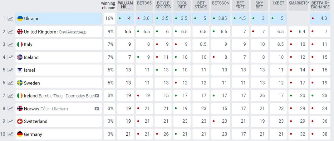 Так, больше всего шансов победить у Украины — 16%. На втором месте — Великобритания (9%), которую представит Олли Александер, а на третьем — Италия (7%).