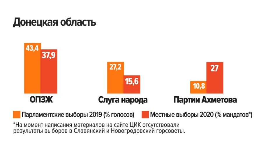 hromadske проанализировало партийный состав вновь избранных городских советов Донецкой области. На момент написания этого материала ОПЗЖ получила лишь 37,9% мандатов, «Слуга народа» — 15,6%. А вот политические проекты, связанные с Ахметовым, в сумме будут иметь 27% депутатов городских советов.