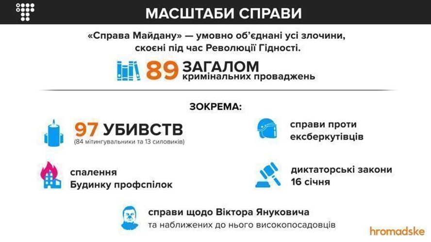 Все преступления, совершенные во время Революции Достоинства, условно объединены в одно большое Дело Майдана, которое насчитывает 89 уголовных производств. В них, в частности, расследуют убийство 97 человек (84 митингующих и 13 силовиков).