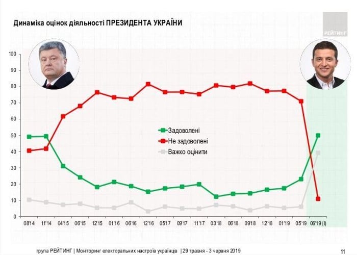 Половина украинцев довольны деятельностью новоизбранного президента Владимира Зеленского, 11% — противоположного мнения. При этом 39% еще не смогли оценить работу новоизбранного главы государства.