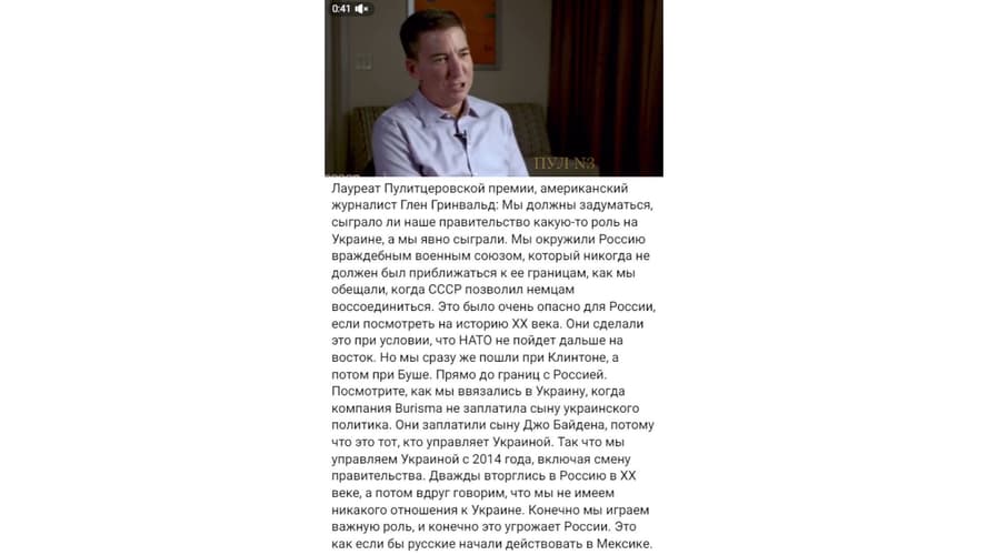 В других своих речах Гринвальд размышляет о том, что для США «нет смысла» помогать Украине в борьбе против россии. А в интервью пророссийскому американскому телеведущему Такеру Карлсону Гринвальд громко заявляет о деятельности «биолаборатории» США в Украине. Таким образом, журналист переводит ответственность за войну с россии на любого другого.