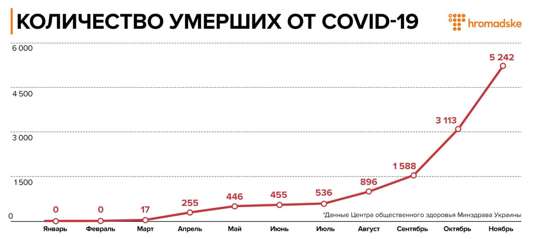 Относительная стабильность 446-536 умерших в месяц держалась в мае-июле, после первого локдауна. А с августа количество умерших растет в геометрической прогрессии — ежемесячно увеличивается в 1,5-2 раза.