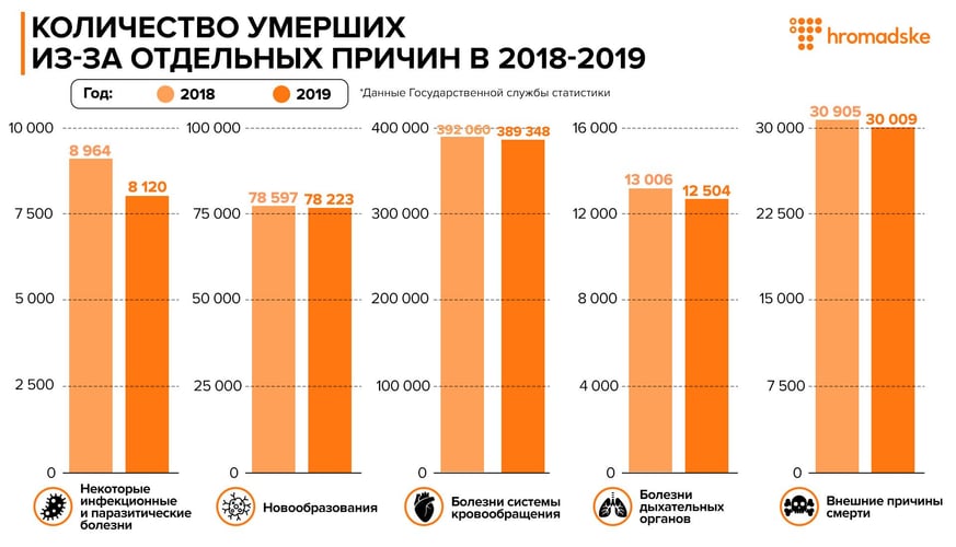 В 2018 году, по данным Государственной службы статистики, умерли 587 665 человек в 2019-м — 581 114. Самая частая причина смерти — более 65% случаев — болезни системы кровообращения. Это, в частности, ишемическая болезнь сердца, инсульт, тромбоз и др. Около 14% умерли от новообразований, не более 5% — от внешних причин: аварии, пожары, отравления и убийства.