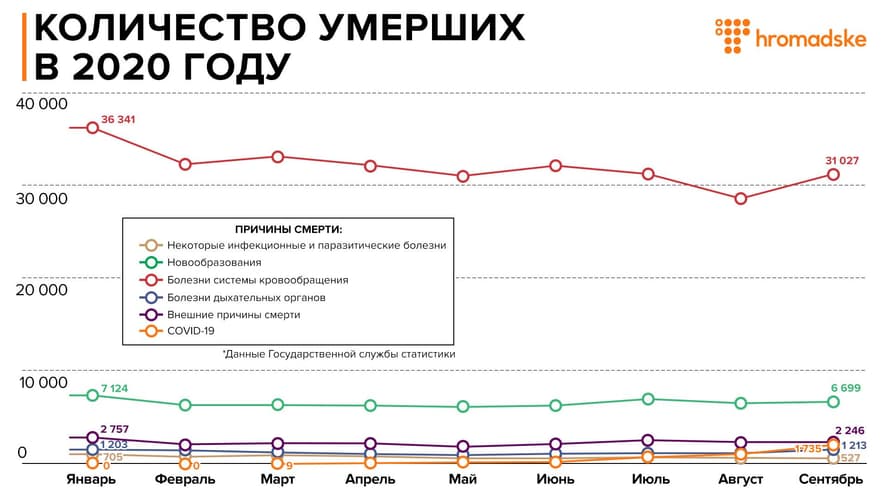 Коронавирусная болезнь COVID-19 в эти 2% не входит, ее служба статистики выносит в отдельную категорию. В период с января по сентябрь, по данным Госстата, от COVID-19 умерли 4300 украинцев, и это не превышает 1% смертей за этот период.