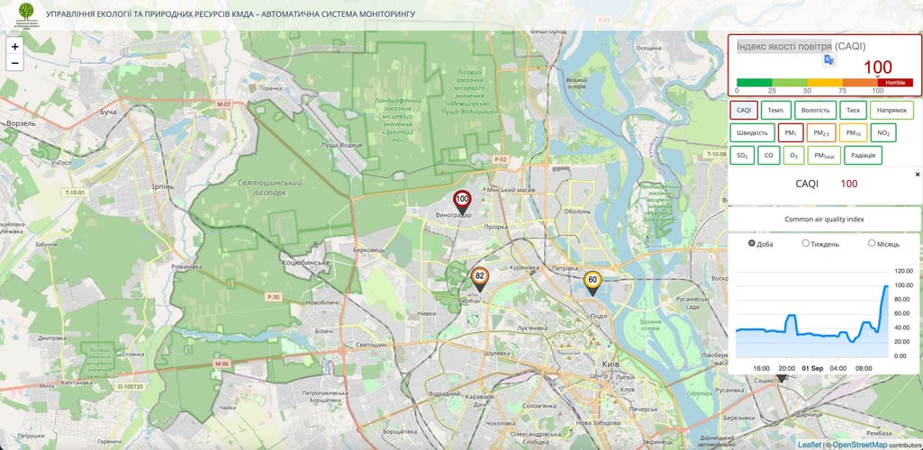 Автоматическая система мониторинга Индекса качества воздуха от Управления экологии и природных ресурсов КГГА фиксирует загрязнение, особенно в районе Виноградаря.