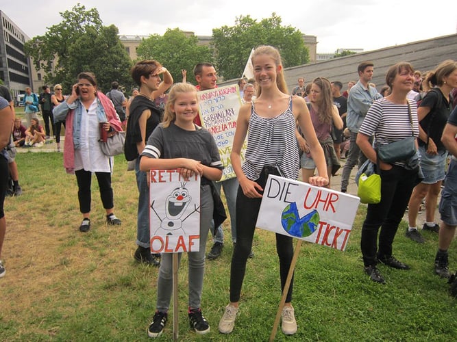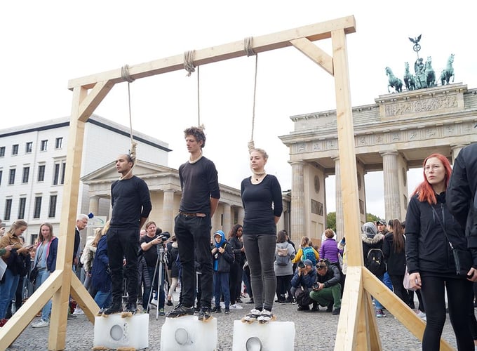У Бранденбургских ворот активисты с петлями на шеях стоят на глыбах льда. На нескольких крупных перекрестках сидячие забастовки блокируют проезд. В центре города шествия с плакатами: «Ледники тают», «Зачем учиться, если будущее не наступит?», «У нас нет запасной планеты».
